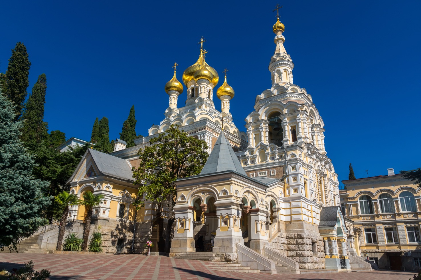 The cathedral rises in the very center of Yalta. Complex, multi-domed, and adorned with arches and mosaics, it resembles 17th-century Moscow churches. Its architecture combines Russian austerity with vibrant Byzantine painting.