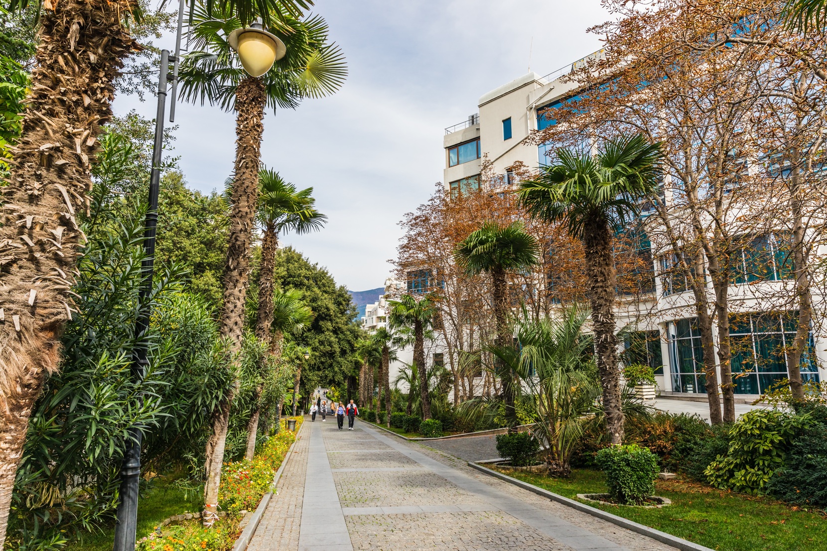 This park is one of the greenest corners of Yalta. It stretches along the shore from the "Oreanda" Hotel and covers a vast area. Running parallel to the Seaside Park is the promenade area of the Seaside Beach, which reopened after renovation in 2019. The beach consists of three tiers of public space. The lower tier is dedicated to beach services, equipped with shade canopies, umbrellas, sun loungers, and water attractions. The second tier features small restaurants, cafes, and boutiques, while the third—the uppermost—has observation decks and a walking area. The park houses a monument to Maxim Gorky and a small obelisk commemorating the Soviet decree on using Crimea for the treatment of workers. There are sculptures, a music-synchronized dancing fountain, and a mineral water pump room. Another attraction is the swimming pool shaped like the Black Sea.
