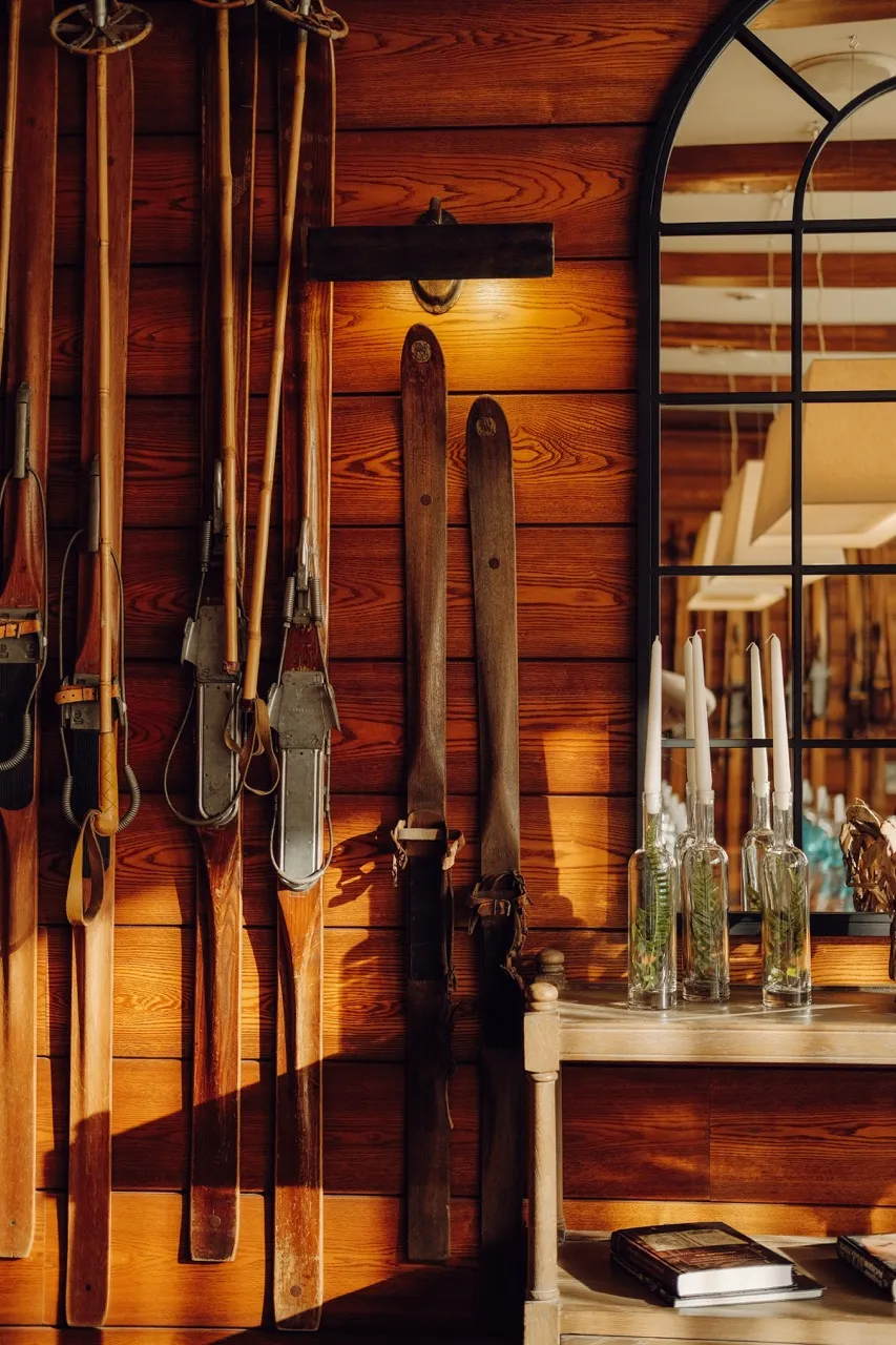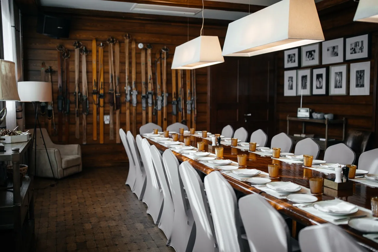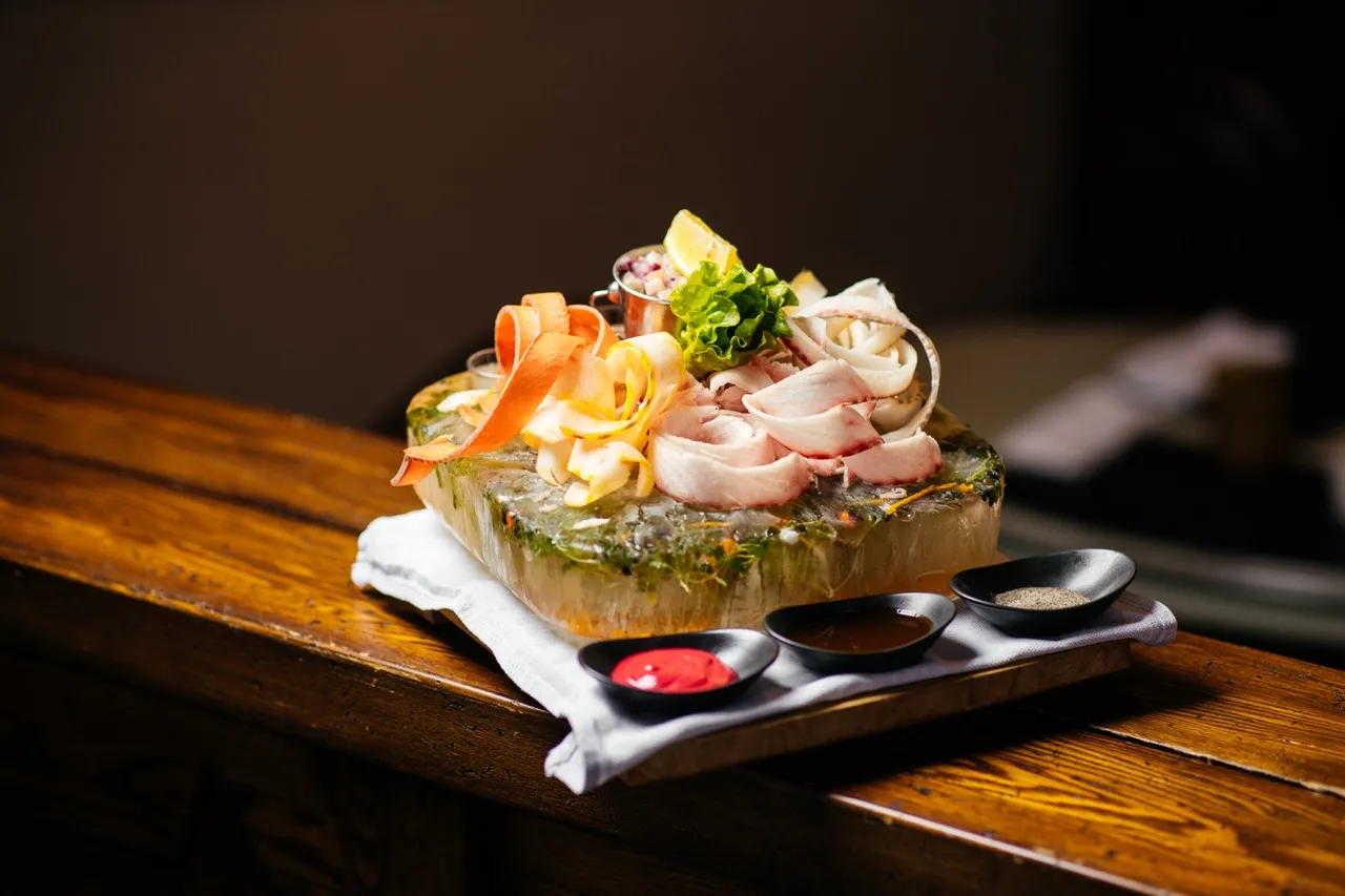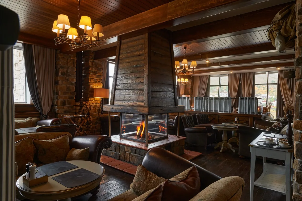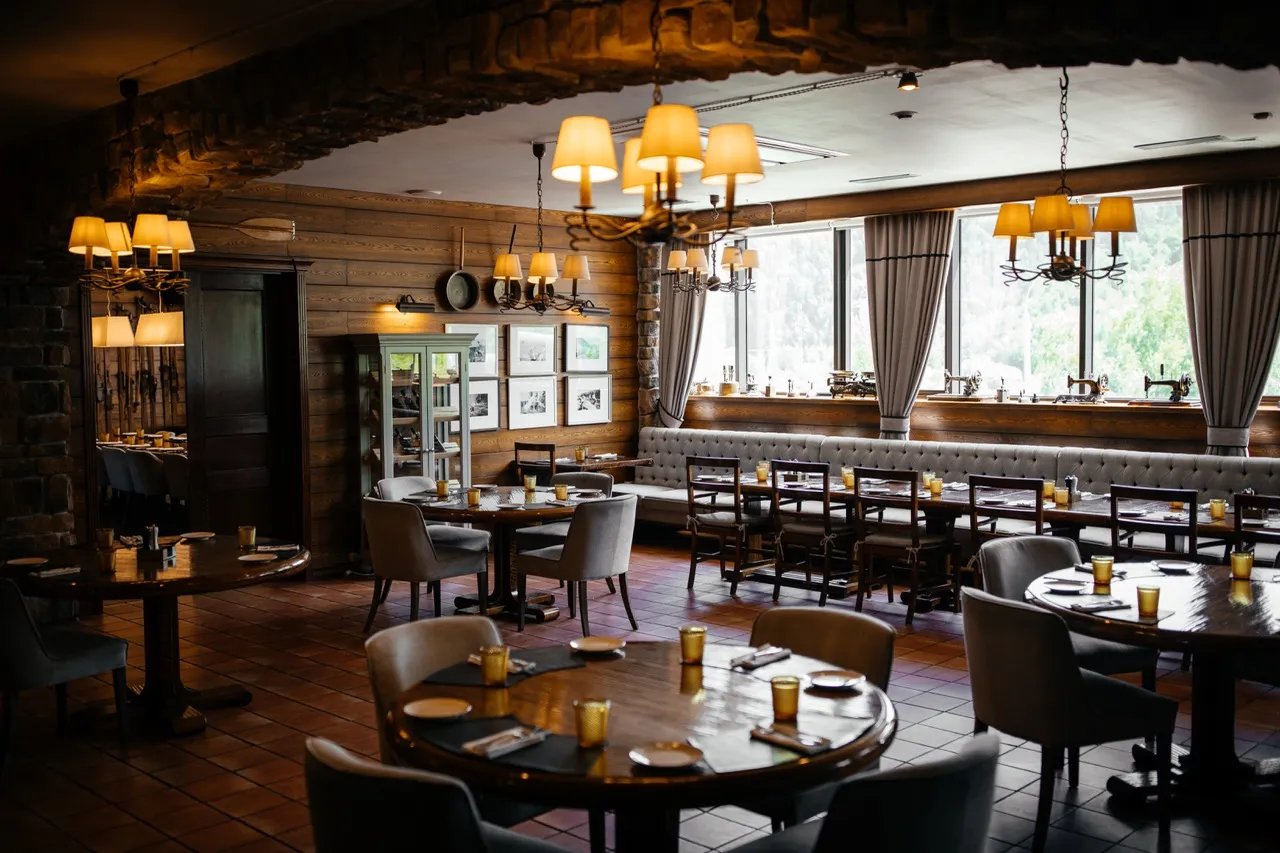 Local cuisine featuring original dishes made with northern ingredients. The menu focuses on premium meat delicacies: ibarch (sausage) made from reindeer meat, wild boar dumplings with spicy feta sauce, and venison with lingonberry sauce and fern shoots. The alpine chalet-style interior is adorned with authentic props and photographs from the archive of "The Master of Taiga" film crew.
