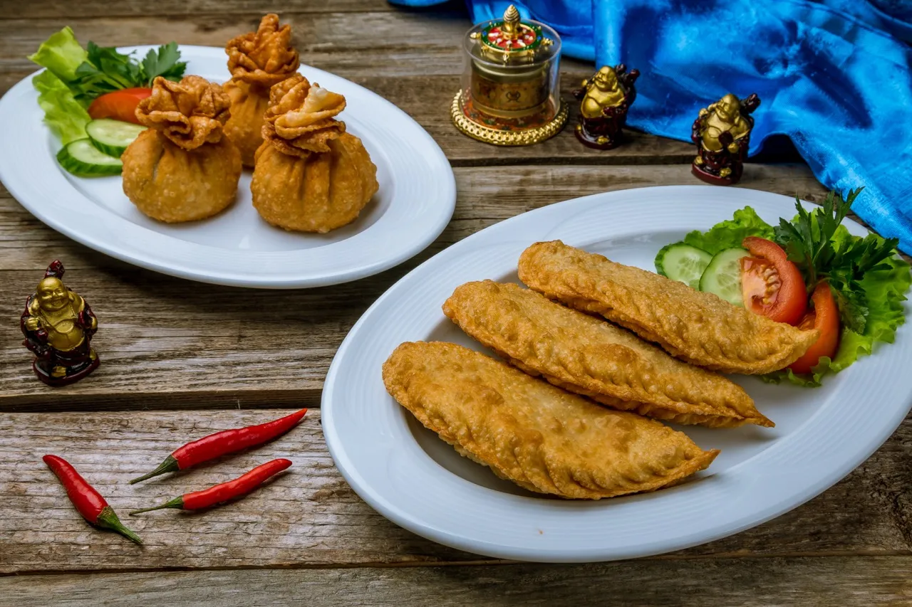Made from lamb and beef. The meat is finely chopped, mixed with onions, garlic, salt, and spices, and wrapped in dough. These half-moon pies are fried in oil until golden. They are traditionally eaten by hand.