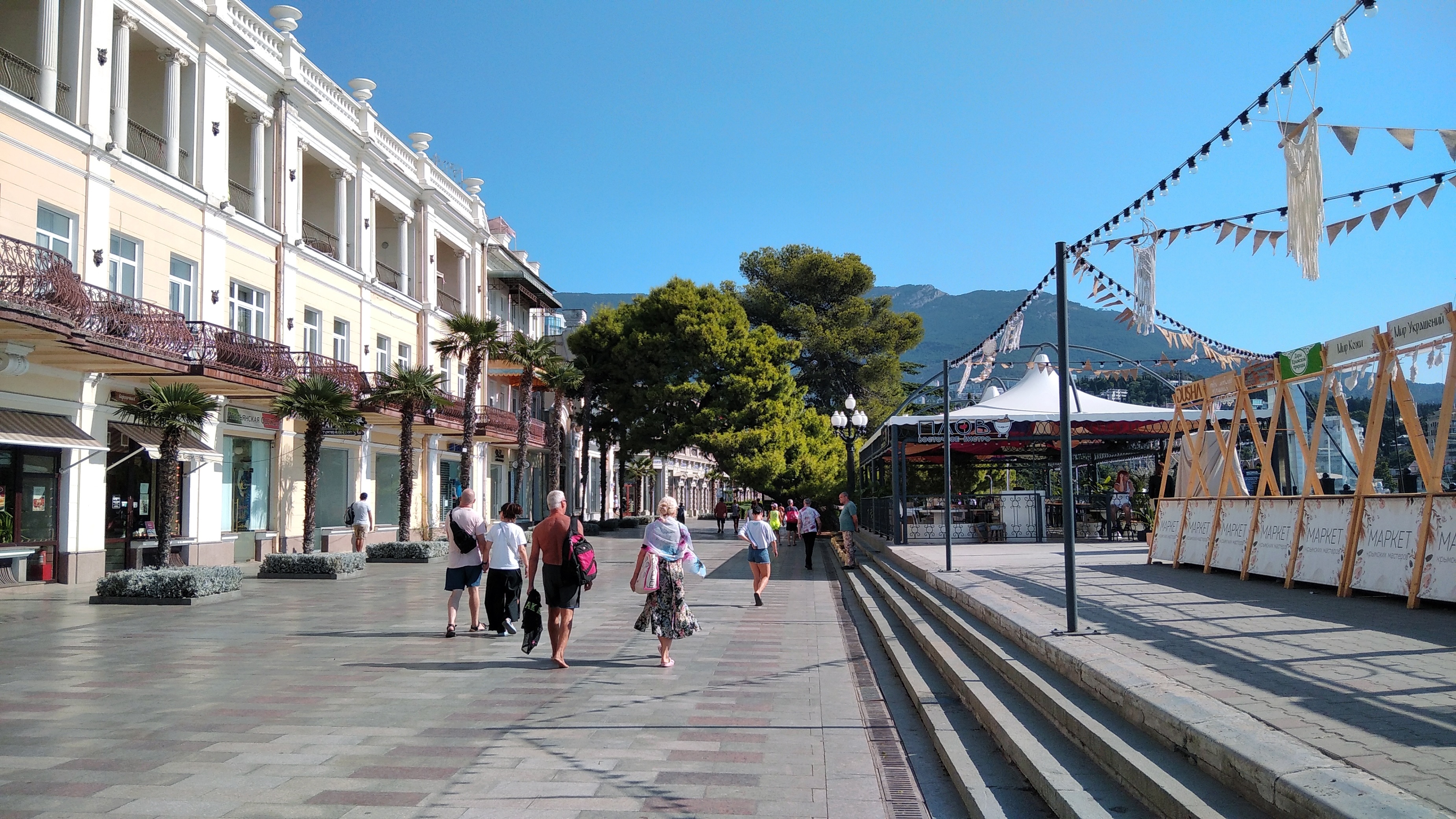The main promenade of Yalta stretches along the shore. It's always crowded here: some people photograph the waves, others pick out souvenir magnets, and some go fishing. The space is designed for leisure—a wide pedestrian zone, palm trees, benches, and flowers. Along the embankment, you'll find hotels, cafes, monuments, and the entrance to the Yalta-Gorka cable car, which runs above the city center. Along the way, you can see the building of the "Tavrida" Hotel, where Nikolai Nekrasov once stayed, as well as the historic Roffe Baths. There's also a Lenin monument and the "Yubileyny" concert hall. Boat tours start at the pier. In the western part, there's a chapel, and right by the water—a bench near a plane tree where Isadora Duncan and Sergei Yesenin once met. The embankment is lush with greenery—acacias, viburnum, palm trees, cherry blossoms, and wisteria. In spring, the air is sweetly fragrant; in autumn, it's more tart. The palm trees here aren't just exotic southern plants but a familiar part of the landscape: they were planted as far back as the 19th century, took root, and became locals.