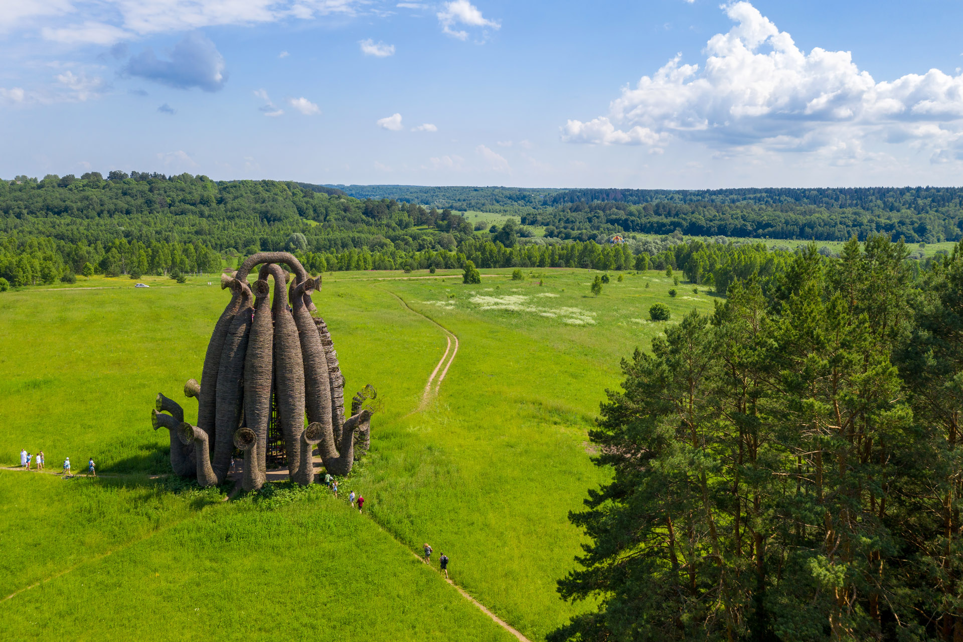 Among forests and meadows, on hills and on the banks of the Ugra River, stand fantastic art objects — wooden towers of unusual shapes, dizzying rotundas, giant animal figures, each with its own story and artistic meaning.