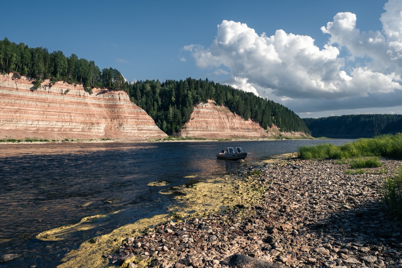 This is the name given to unusual cliffs along the riverbank. They formed after the river eroded the shore, making it resemble a layered cake. Each such "layer" took at least a million years to form. Coordinates: 60.583530, 45.501352