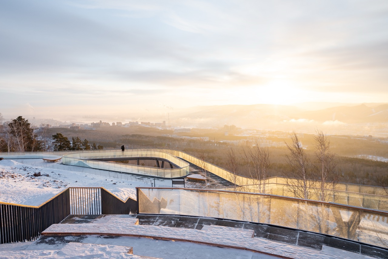 This platform is located in the Lower Academgorodok area. From here, you will enjoy the smooth surface of the Yenisei River and see the "Krasnoyarskie Stolby" National Park, the Takmak rock, and the Holy Assumption Monastery, which is accessed via a winding path. Here, you can take stunning photos and see two unique art objects — the benches "Splav" and "Lighthouse" shaped like rafts. Coordinates: 55.983095, 92.758606